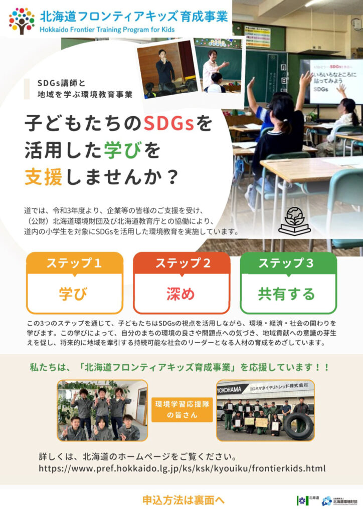 令和8年度 「北海道フロンティアキッズ育成事業」へ協賛 2026-02-18 最終更新日時 : 2026-02-18 editor01 子供たちのSDGsを活用した学びを支援しています。 弊社も僅かながら寄付させていただきました。